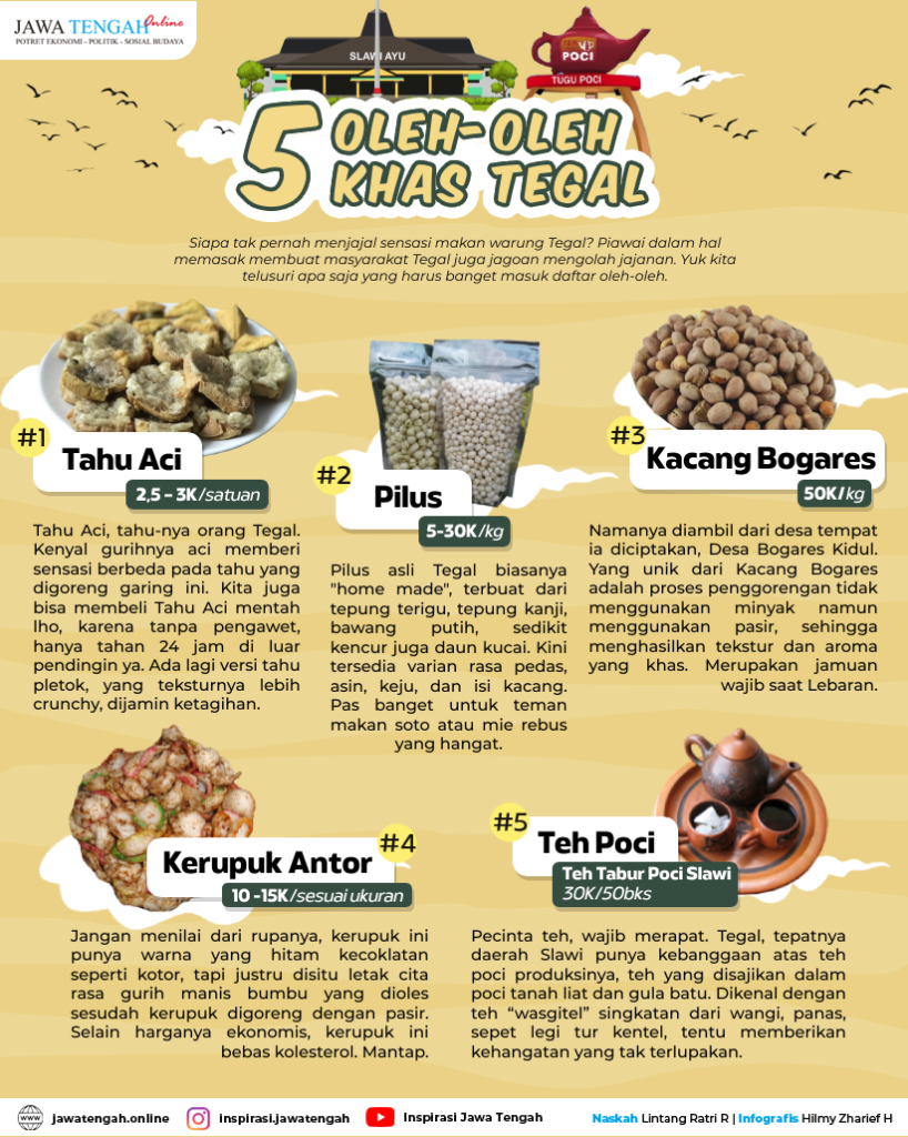 Selain teh poci, Tegal mempunyai kuliner khas yang lain, seperti tahu aci, pilus, kacang bogares, krupuk antor dll. Kalau mampir Tegal, ingat selalu mencari oleh-oleh ini.
