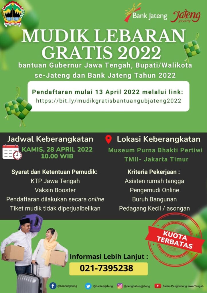“Adapun syarat mengikuti mudik adalah ber KTP Jawa Tengah, sudah vaksin booster. Sementara kriteria pekerjaan yang boleh ikut serta adalah Asisten Rumah Tangga (ART), pengemudi online, buruh bangunan, pedagang kecil/asongan,” jelas dia.