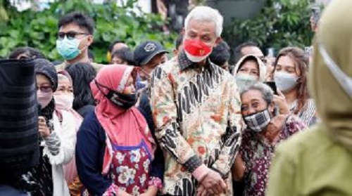 SOLO- GUBERNUR Jawa Tengah Ganjar Pranowo mendampingi Joko Widodo atau Jokowi menemui sejumlah pekerja seni di Taman Balekambang Surakarta, Kecamatan Banjarsari, Kota Surakarta, Jawa Tengah, pada Kamis, 26 Mei 2022.